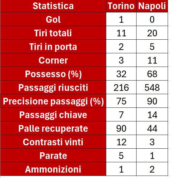 —Il Napoli domina palla e territorio: possesso 68%-32%, 548 passaggi riusciti con 90% di precisione (Torino 216 al 75%). Gli azzurri avanzano con continuità (267 passaggi in avanti, 94 azioni manovrate) e spingono sulle corsie (43 cross, 10 riusciti). Il Toro “sa soffrire”: vince i contrasti (12-3), recupera più palloni (50-44), accetta di stare basso e sporca il ritmo avversario. Meno palleggio, più sostanza: 19 cross (6 riusciti), 30 passaggi lunghi per uscire dalla pressione e una densità centrale che costringe il Napoli a molti tentativi da fuori (10 tiri).