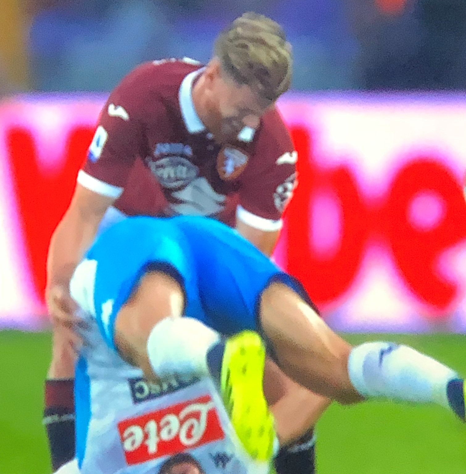 Al Grande Torino / Paura per il terzino albanese degli azzurri, l'argentino attutisce la caduta
