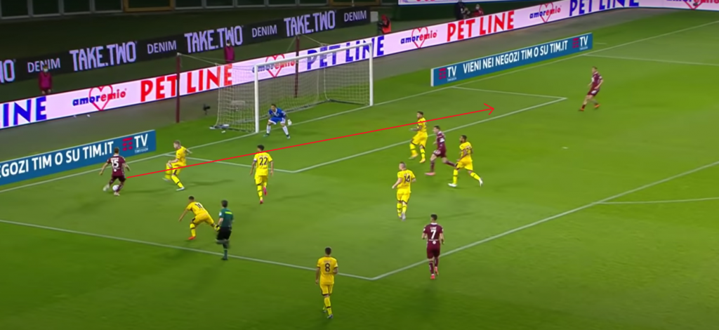Dagli sviluppi di una rimessa laterale, Ansaldi intravede uno spazio sulla fascia e cerca di conquistare il fondo del campo per crossare.