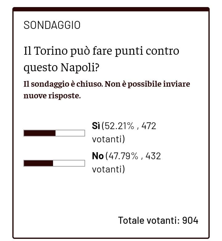 Non è una maggioranza bulgara, ma quel 52,21% è un risultato che fa filtrare un cauto ottimismo fra i tifosi granata. Sono, infatti, 472 su 904 votanti i lettori che pensano che il Torino possa fare punti contro questo Napoli schiacciasassi, reduce dalla vittoria in Champions contro l'Eintracht Francoforte e quindi dal conseguente passaggio del turno ai quarti della massima competizione europea per club. I granata vengono da due vittorie consecutive contro Bologna e Lecce e devono vendicare la disfatta dell'andata, forse una delle pochissime partite in cui è mancata una prestazione di livello. Ottenere anche un pareggio rimane un' impresa e lo dimostra anche il 47,79% (432) dei lettori che hanno vitato al sondaggio e che pensano che il Torino non farà punti contro gli azzurri.