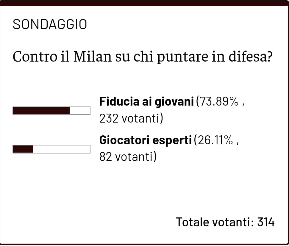 Domenica 30 ottobre alle 20.45 il Torino scenderà in campo tra le mura amiche contro il Milan: noi di Toro News, attraverso il consueto sondaggio settimanale, abbiamo chiesto a voi lettori se contro i rossoneri puntereste sulla fiducia ai giovani del reparto arretrato o se preferireste affidarvi a profili di esperienza come Djidji e Rodriguez. Il risultato è chiaro, su 314 votanti ben 232 (pari al 73.89%) darebbe fiducia ai giovani Schuurs e Buongiorno, mentre solo 82 (il 26.11%) votanti opterebbero per l'esperienza di Rodriguez (ex della gara) e Djidji.