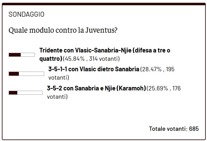 Nelle scorse qui sulle colonne di Toro News abbiamo proposto un sondaggio ai nostri lettori chiedendo loro quale soluzione offensiva avrebbero provato per il derby di questa sera contro la Juventus. Il responso emerso dalle risposte al sondaggio è stato abbastanza chiaro perché, in assenza di Zapata e probabilmente anche di Adams, per quasi la metà dei votanti la soluzione migliore è quella di un tridente offensivo composto da Vlasic, Sanabria e Njie. Questa opzione del sondaggio ha raccolto il 45,84% delle preferenze mentre le altre due scelte meno del 30% e si trattava del 3-5-1-1 con Vlasic dietro Sanabria (28,47%) e del 3-5-2 con Sanabria e Njie in coppia (25,69%).