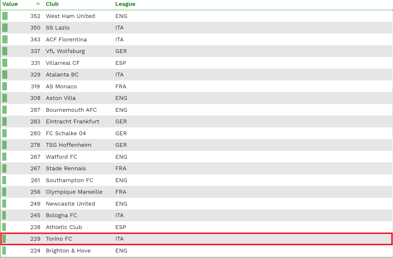 L'International Centre for Sports Studies è noto per alcuni approfondimenti sulle squadre europee di calcio. Anche questa settimana il CIES ha pubblicato uno studio molto interessante sul valore delle squadre in Europa. In base al prezzo di trasferimento con cui sono stati acquistati i giocatori, il CIES ha formulato una classifica per tutti i maggiori campionati. L'analisi in questione tiene conto dei primi 20 giocatori più costosi di ogni squadra, e ovviamente in questa speciale classifica c'è anche il Torino.