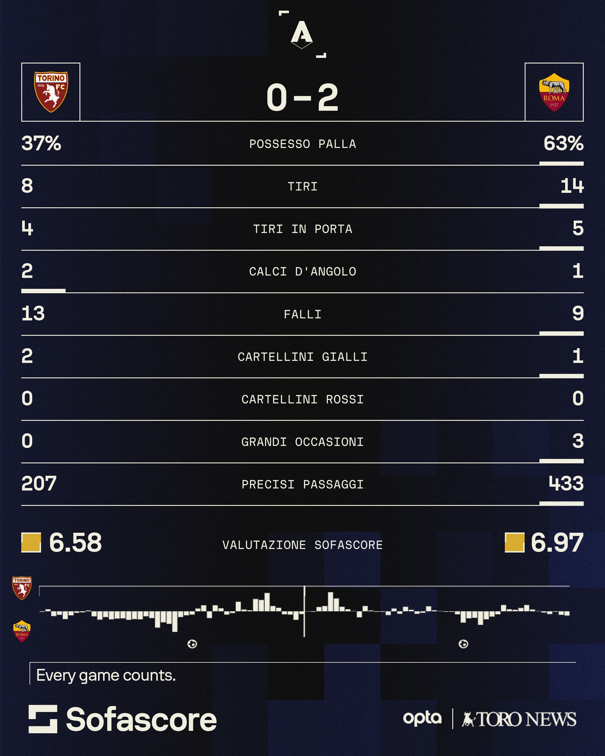 I numeri Sofascore spiegano il perché della sconfitta: 0,41 xG e zero grandi occasioni per il Toro, Roma a 1,84 xG e 3 chance nitide.