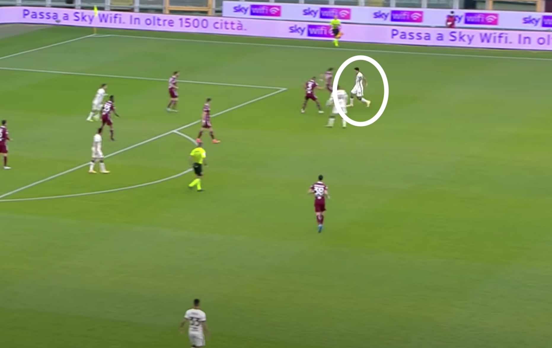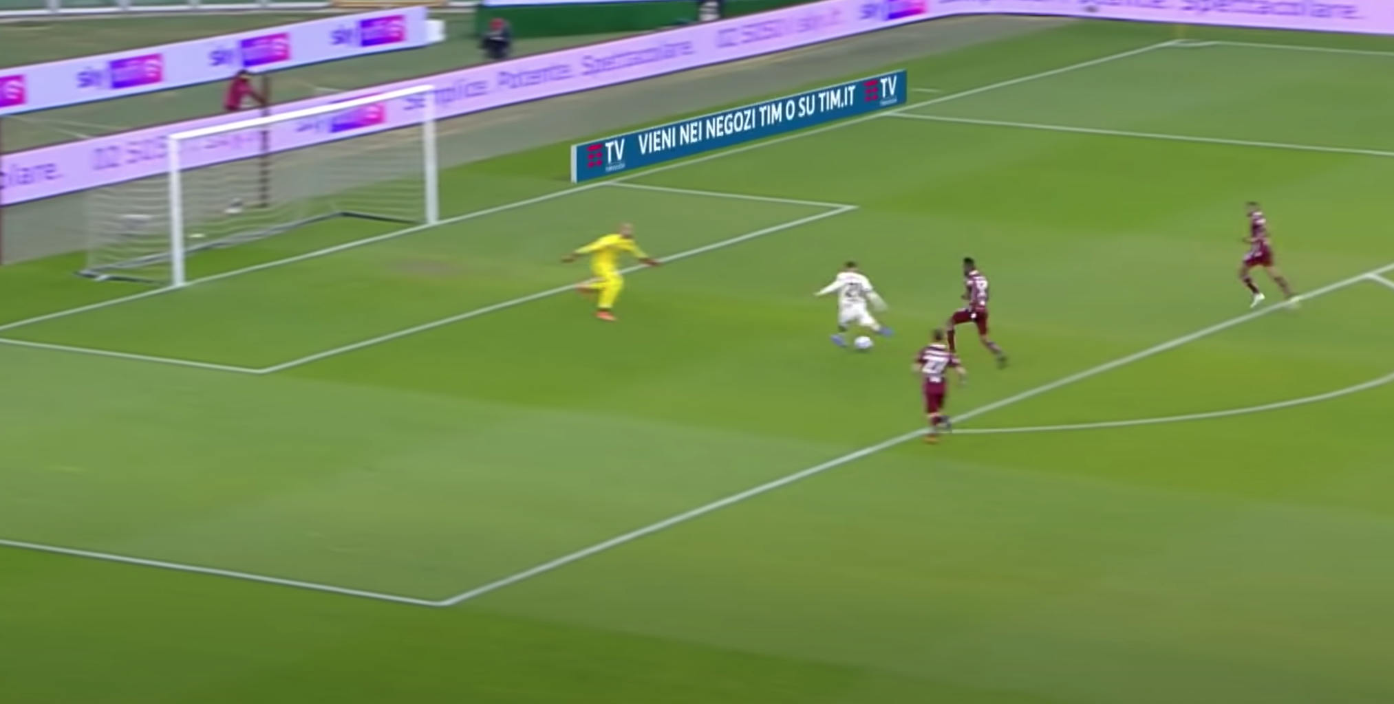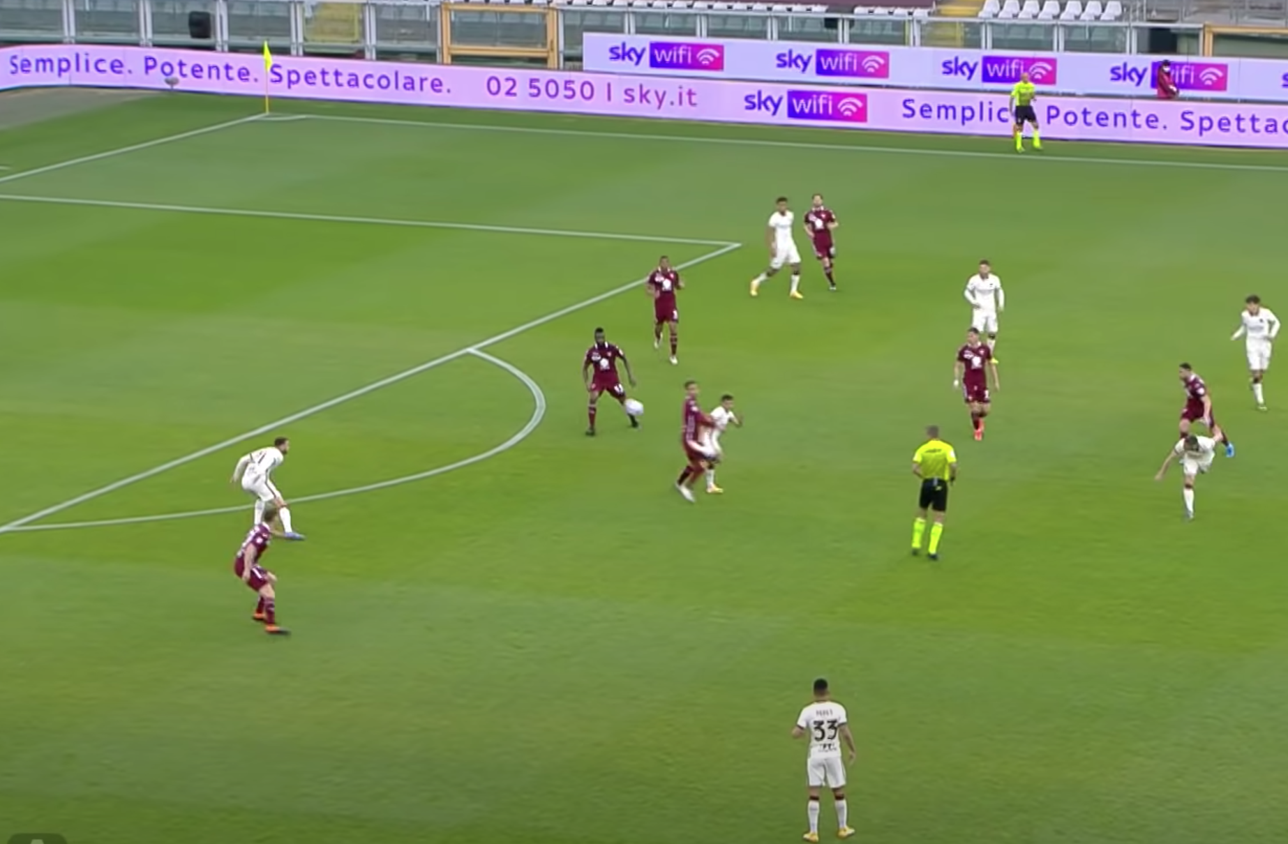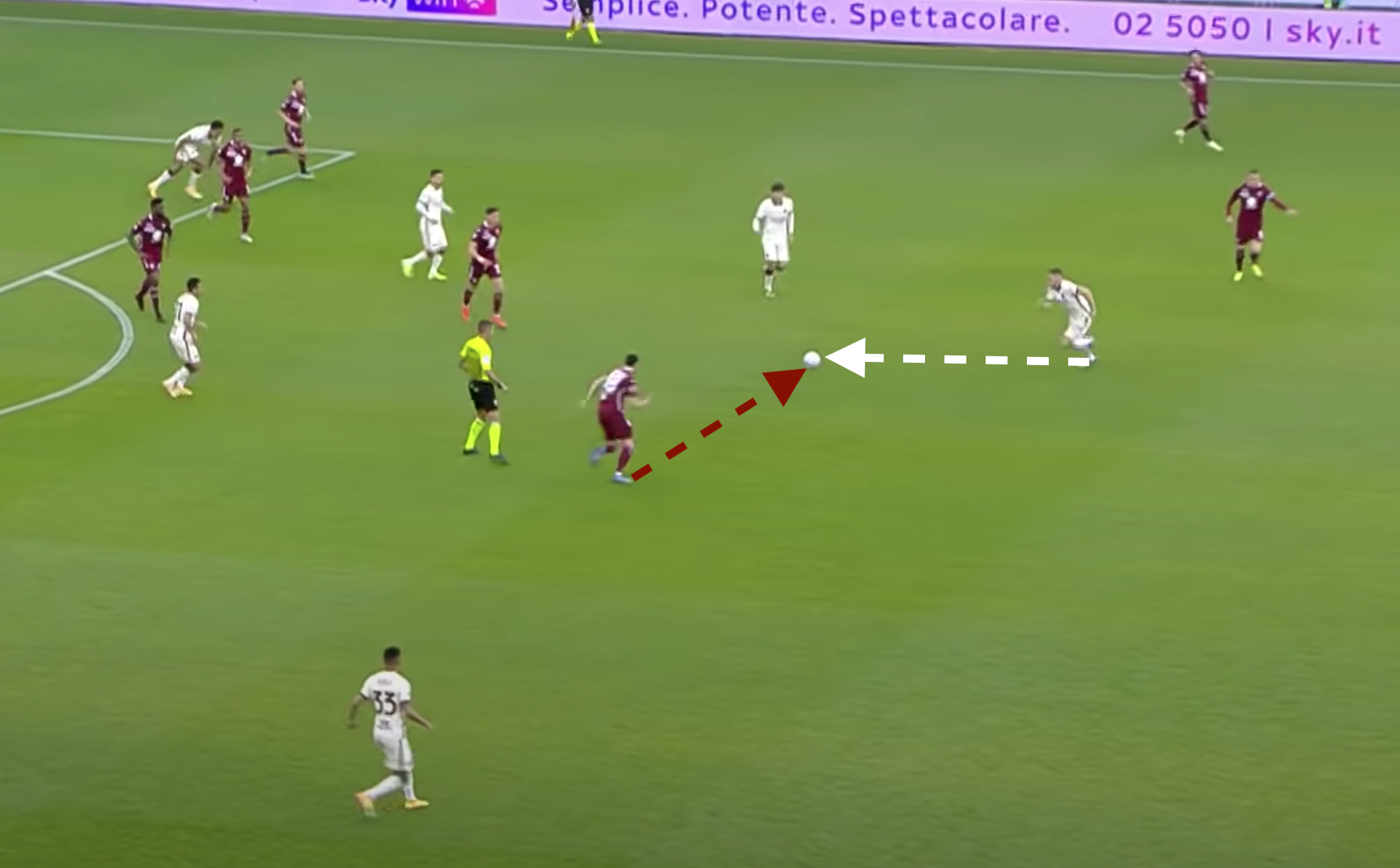 Pedro aggiusta la palla di tacco e manda in profondità Borja Mayoral. La punta della Roma è totalmente isolato, con i granata che non sono stati in grado di leggere il suo movimento. Izzo ha accorciato su Pedro, mentre né Nkoulou né Vojvoda si curano del movimento dell'attaccante giallorosso. Altro errore è quello di Bremer, che tiene in gioco Mayoral.
