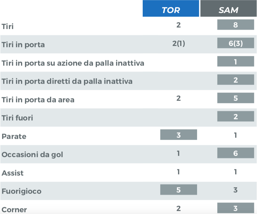 Altra sconfitta per il Torino e, anche in questa occasione, i dati non lasciano spazio a interpretazioni e sorridono alla Sampdoria. Tre punti meritati per i blucerchiati, con la squadra granata che non è riuscita ad essere incisiva in zona offensiva e ha subito troppo in difesa. Otto tiri hanno effettuato i blucerchiati, solo due quelli dei granata. Le statistiche dicono che il Toro ha prodotto solo un'occasione da gol, a differenza delle sei degli ospiti. Tre i corner guadagnati dalla squadra di Ranieri, due quelli dei granata.