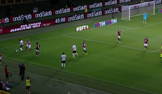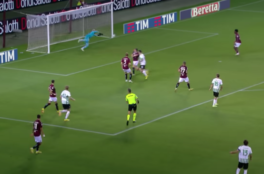 Il terzino del Sassuolo riceve tutto solo, Singo prova a raggiungerlo in tempo ma Rogerio ha tempo per prendere la mira e mettere in mezzo.