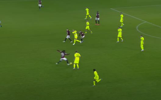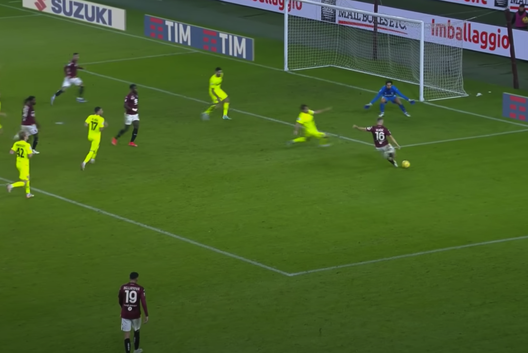 Nella ripresa il Toro torna in vantaggio. Tameze recupera palla sulla trequarti anticipando di netto Thorsvedt, dimostrando di saper leggere bene il gioco.