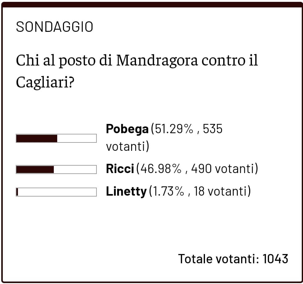 Ieri, mercoledì 23 febbraio, abbiamo chiesto ai lettori di Toro News, attraverso il sondaggio settimanale, chi vorrebbero al posto dello squalificato Mandragora nella partita contro il Cagliari in programma domenica 27 febbraio alle 12.30 all'Olimpico Grande Torino. A prevalere nelle preferenze è stato Tommaso Pobega, che ha raccolto 535 voti su 1043 totali, pari al 51.29%; leggermente staccato Samuele Ricci, con 490 preferenze, terzo posto per Karol Linetty con soli 18 voti.