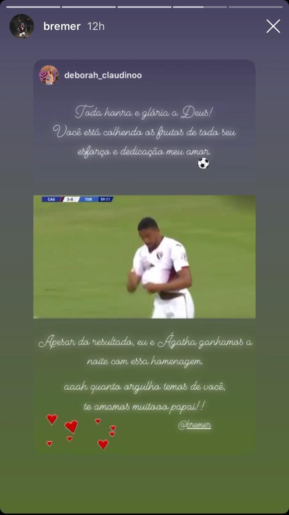 Gleison Bremer ha invece repostato il ringraziamento della compagna Deborah che è incinta, alla quale lui ha dedicato il gol. "Gloria a Dio! Sei frutto di tutti i tuoi sforzi e dedizione, amore mio. Nonostante il risultato, Agatha e io abbiamo vinto. Ti amo così tanto papà".