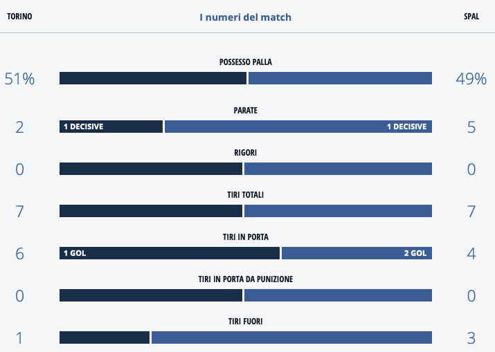 Brutta sconfitta casalinga per il Torino contro la Spal. Le statistiche confermano che non è stato un caso perdere contro la squadra emiliana invischiata nella lotta per non retrocedere. I granata non sono riusciti ad essere superiori nonostante la differenza dei valori in campo. Il possesso palla è vinto dal Toro, ma di poco: 51% a 49%.
