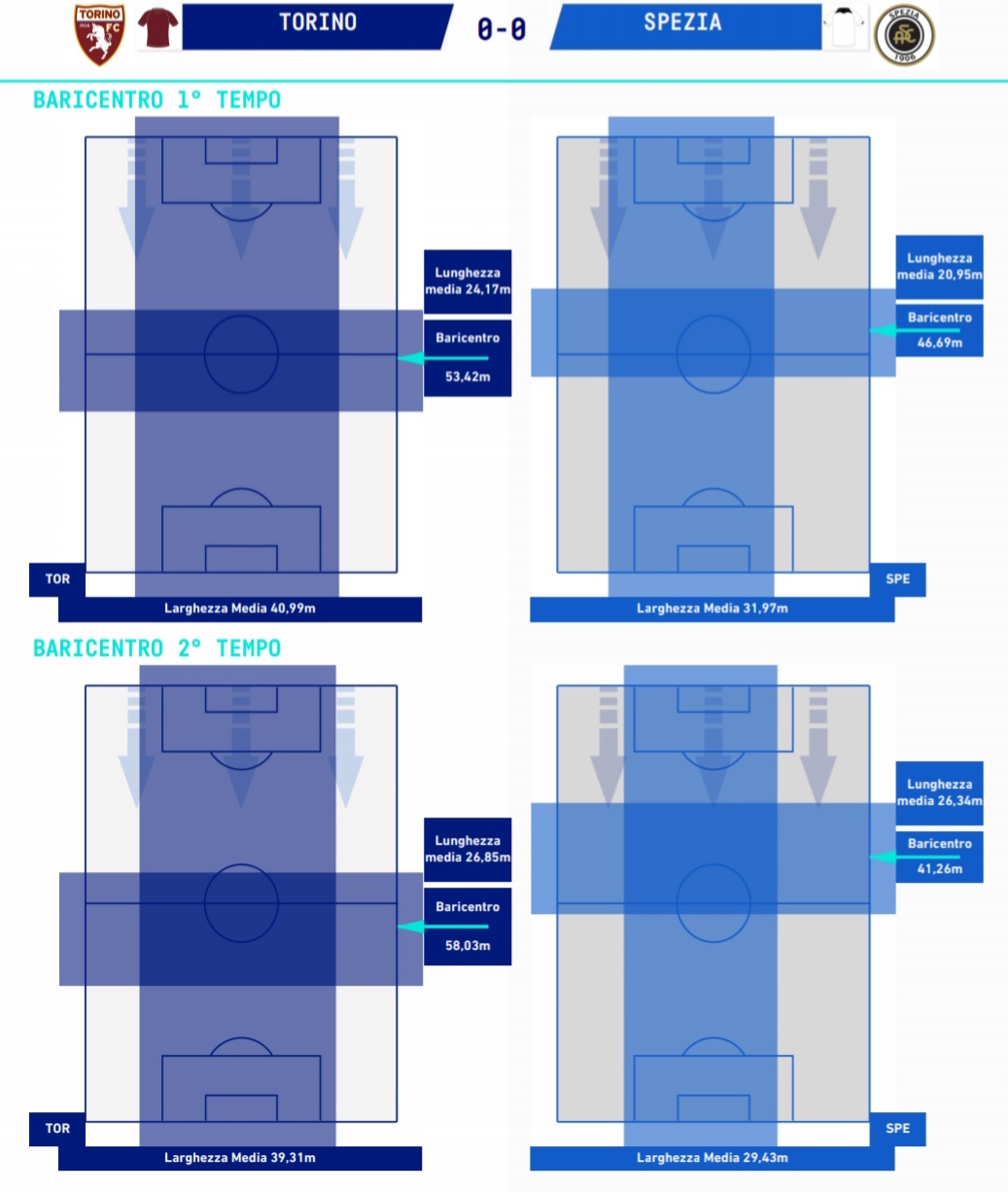 STRATEGIA - Nell'arco dei 90' il Torino ha mantenuto il baricentro sempre più alto rispetto all'avversario, come era ovvio che fosse vista la superiorità numerica. Ma è nei secondi 45' di gioco i granata hanno alzato davvero la pressione e giocato un maggior numero di palloni, soprattutto nei minuti finali. Questo risulta più evidente analizzando i dati sull’altezza media del baricentro di Torino e Spezia. Nella prima frazione di gioco i liguri si sono mantenuti sui 46,69 metri, al di sotto della linea di metà campo. Mentre la squadra di Marco Giampaolo si è stabilita sui 53,42 metri, rimanendo nei pressi della metà campo. Le differenze sono aumentate nel secondo tempo: 41,26 metri per la formazione di Vincenzo Italiano, contro i 58,03 metri del Torino. Ciò, però, non ha portato un risultato favorevole ai granata, che rimangono momentaneamente fermi nella zona rossa della classifica in terzultima posizione.