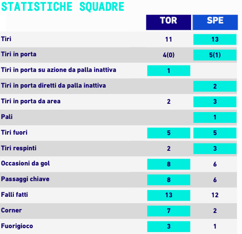 Il Toro ha avuto in mano il pallino del gioco con il 67% del possesso palla, anche se per il 54% del tempo l'ha effettuato nella propria metà campo. Anche lo Spezia ha gestito per il 56% del tempo il proprio possesso palla nella propria metà campo. I bianconeri però sono stati più concreti e hanno effettuato più conclusioni rispetto ai granata: 11 (di cui 4 in porta) contro 13 (di cui 5 in porta e un gol). Gli ospiti hanno colpito anche un palo. Un Torino poco lucido e poco concreto ha dovuto capitolare contro lo Spezia che ha gestito la partita in modo intelligente e ha vinto con merito.