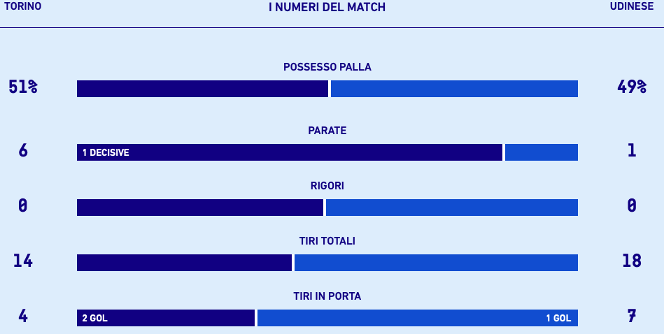 Torino-Udinese 2-1, le statistiche: il pareggio non sarebbe stato bugiardo