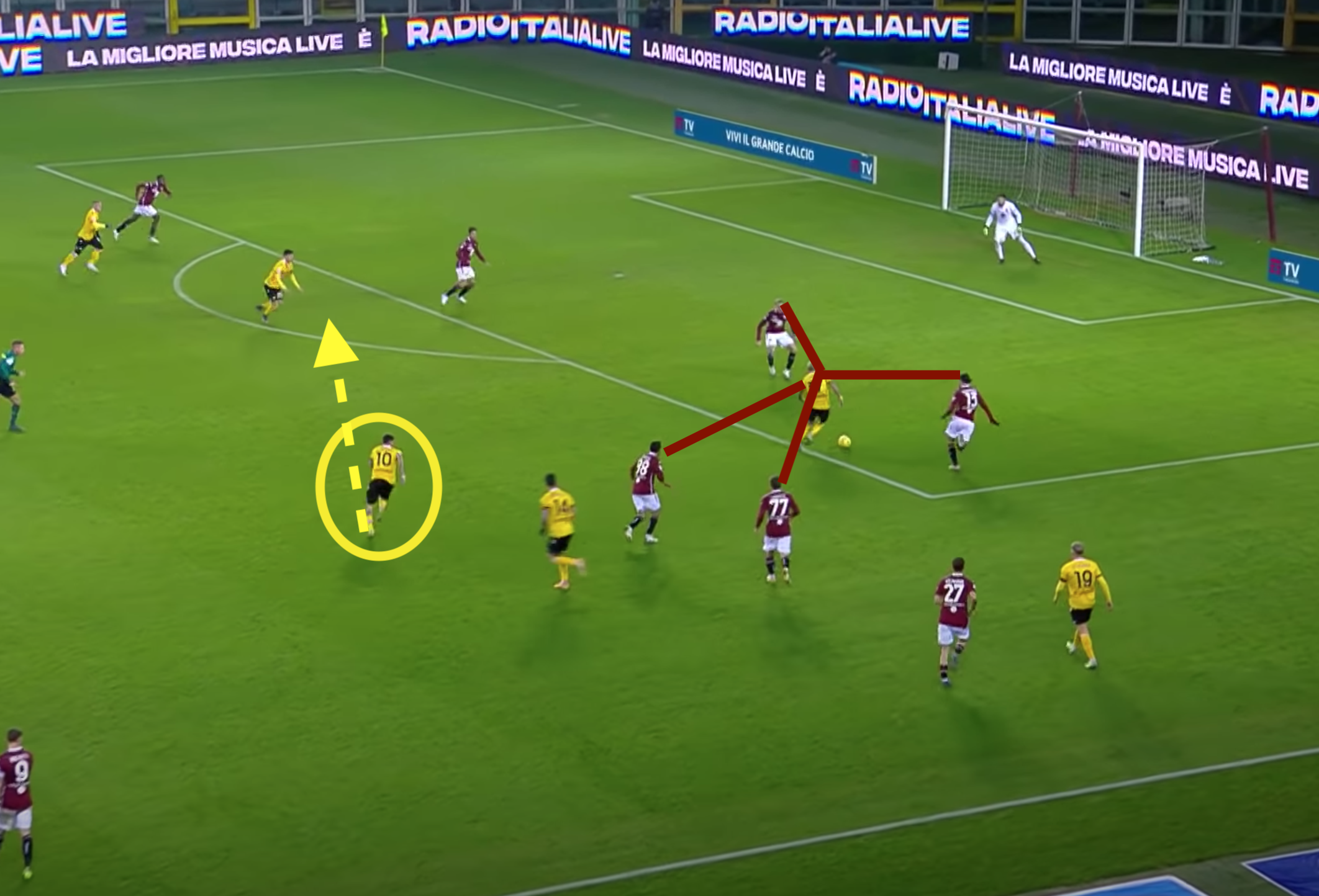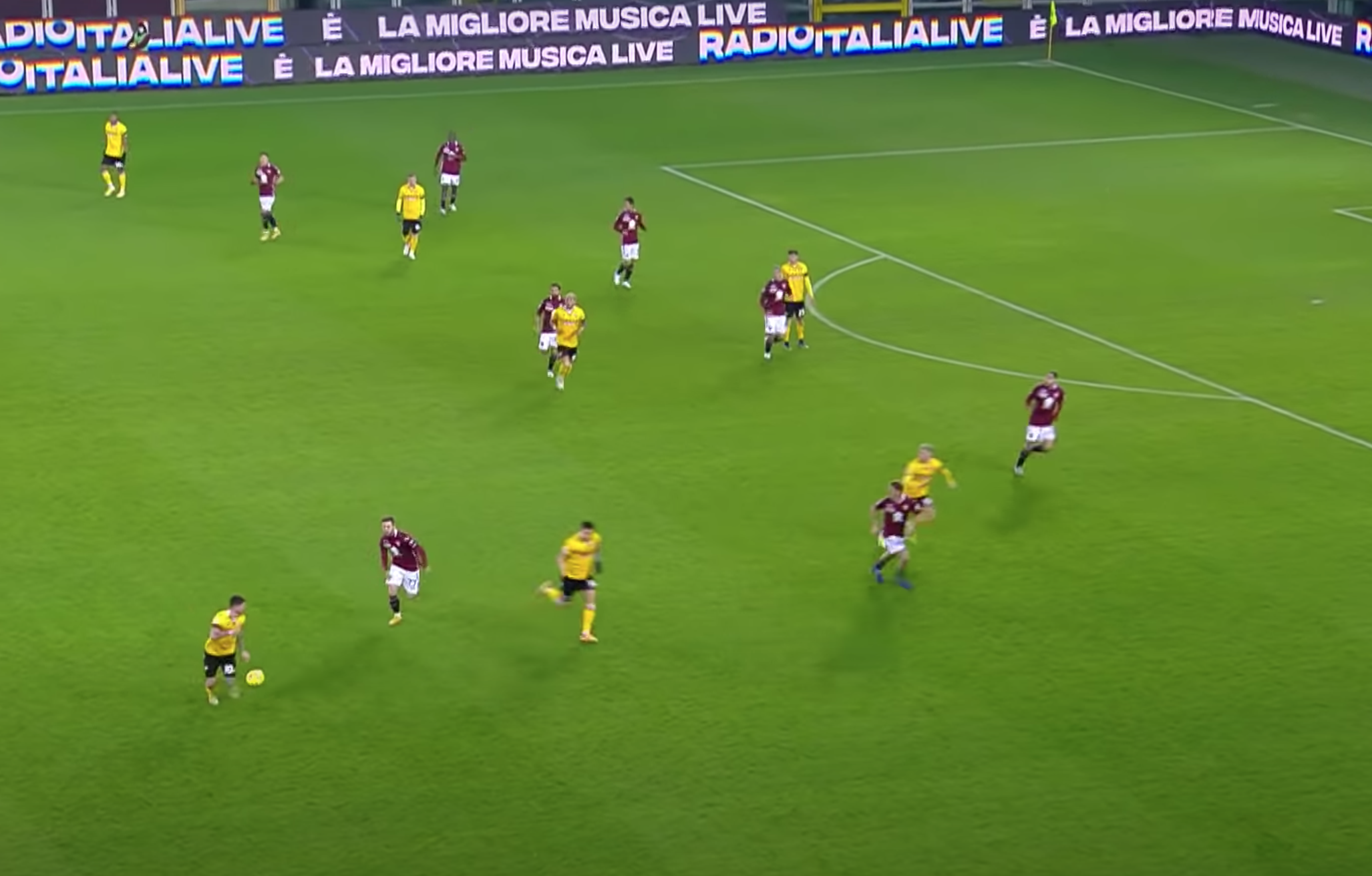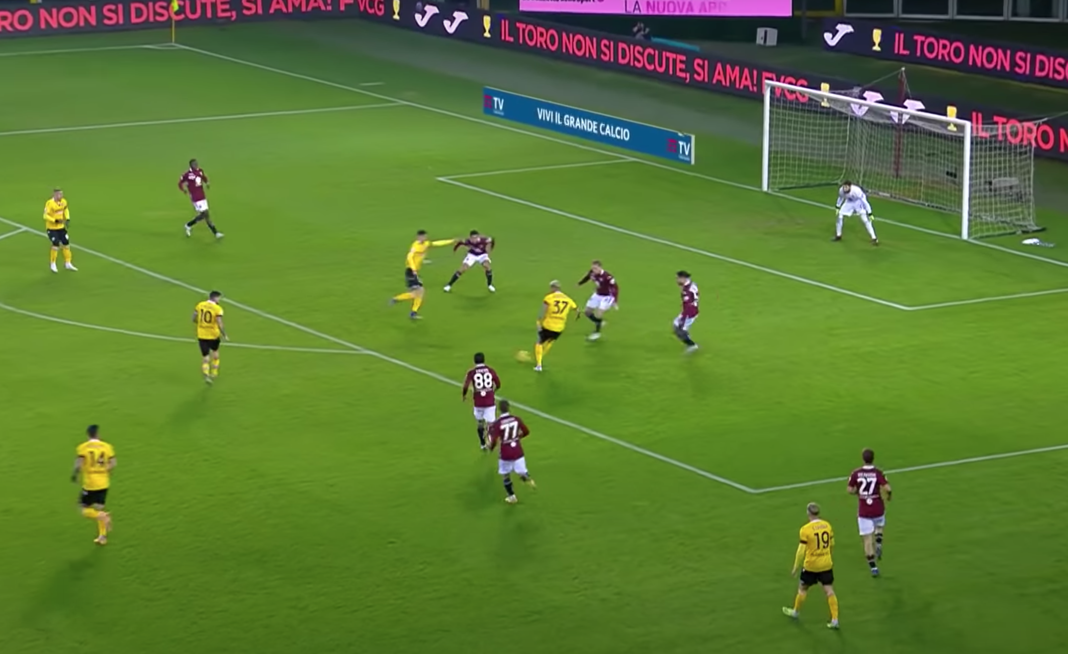 Bonifazi a questo punto suggerisce centralmente per Pereyra, che punta la porta di Sirigu. Qua il Torino fa la frittata. In 4 granata si concentrano esclusivamente sul centrocampista ex Watford e Juventus, nello specifico: Lyanco, Rodriguez, Linetty e Rincon. Gli ultimi due, però, rientrano al piccolo trotto e, soprattutto, non si curano minimamente di Rodrigo De Paul che corre verso il limite dell'area, lasciato indisturbato da tutto il Torino.