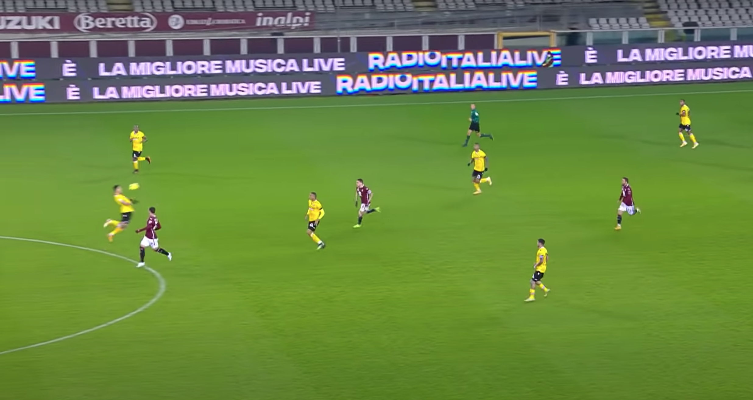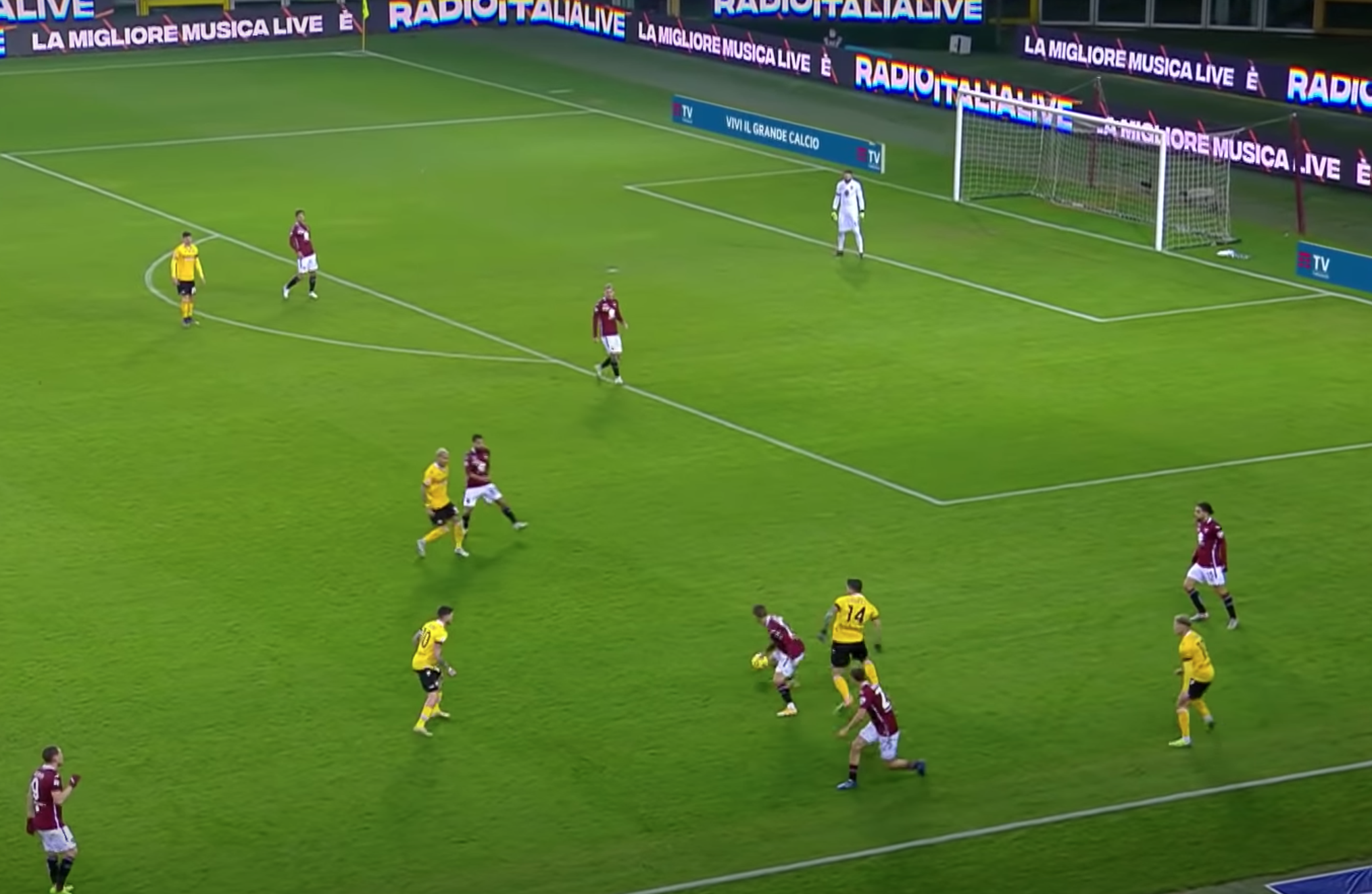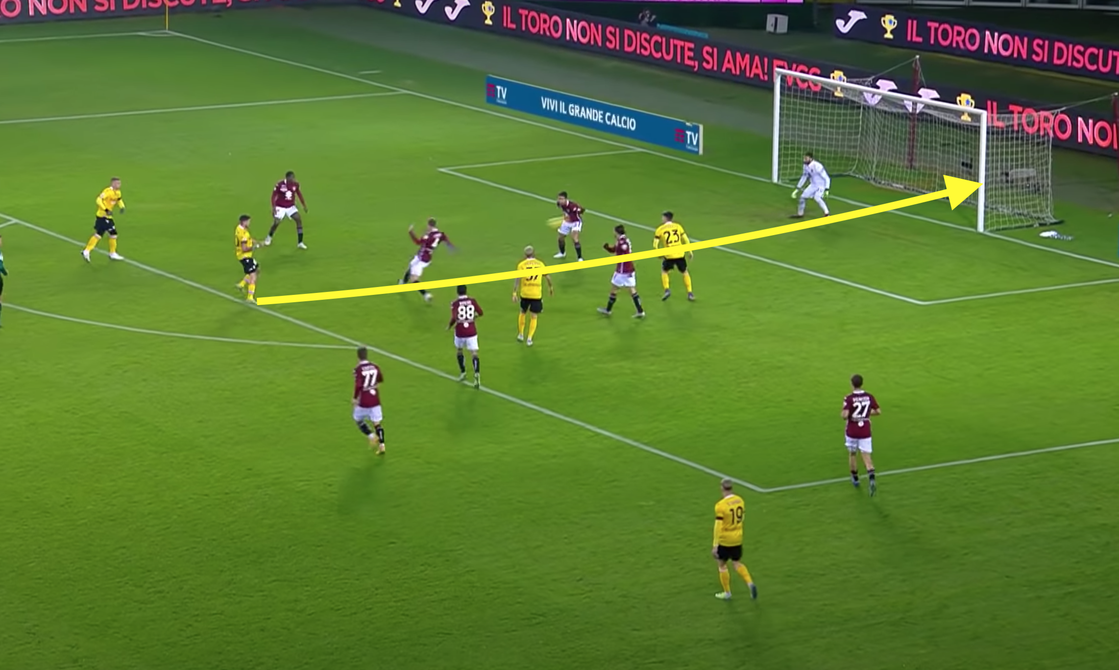 Bonifazi a questo punto suggerisce centralmente per Pereyra, che punta la porta di Sirigu. Qua il Torino fa la frittata. In 4 granata si concentrano esclusivamente sul centrocampista ex Watford e Juventus, nello specifico: Lyanco, Rodriguez, Linetty e Rincon. Gli ultimi due, però, rientrano al piccolo trotto e, soprattutto, non si curano minimamente di Rodrigo De Paul che corre verso il limite dell'area, lasciato indisturbato da tutto il Torino.