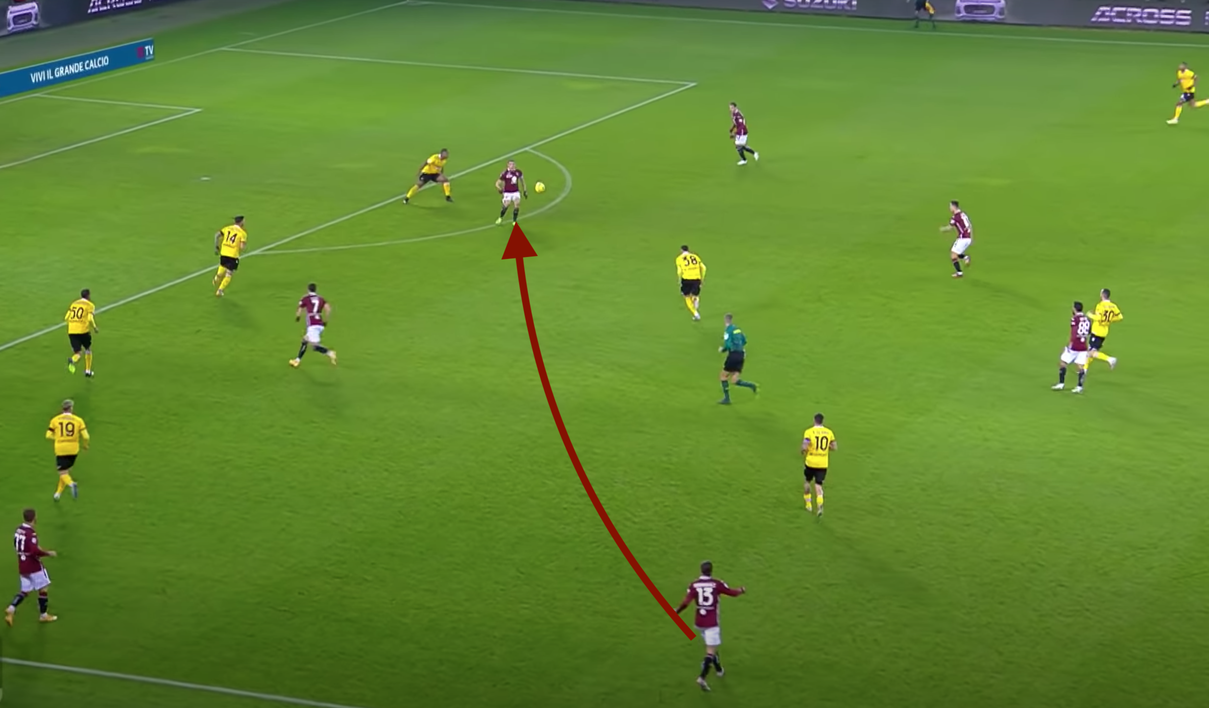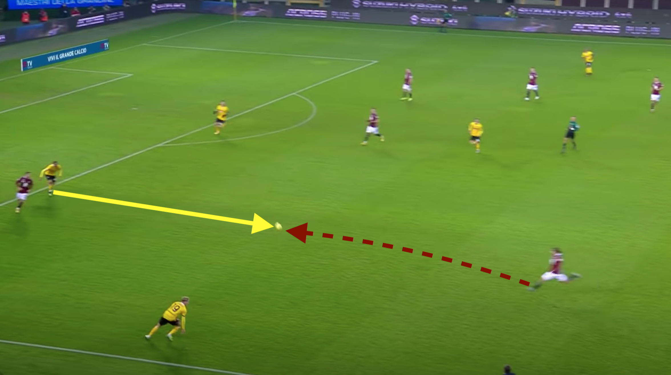 Il Gallo, spalle alla porta, ha una grande intuizione e lascia sfilare, aggiustando la palla con il tacco di prima intenzione per Bonazzoli che si trova isolato alle sue spalle.