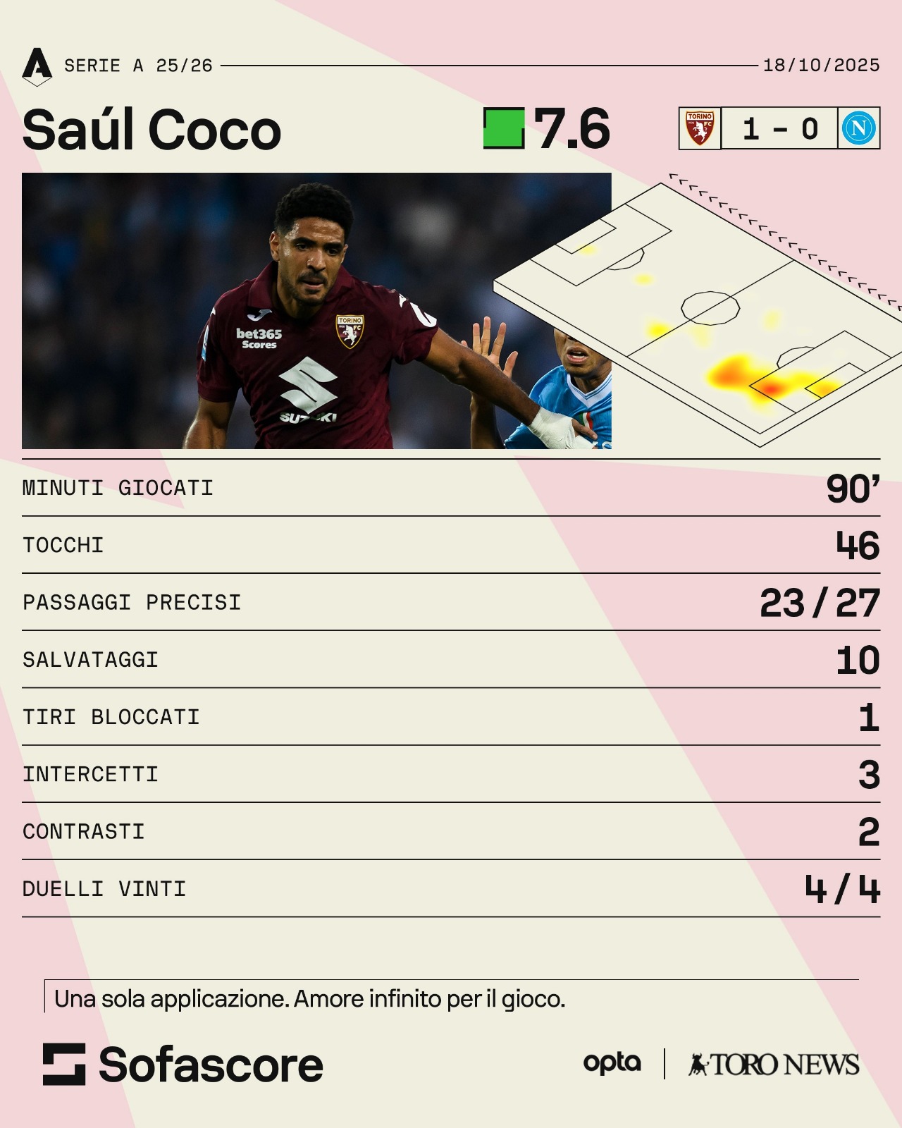 —Coco è apparso cattivo al punto giusto, sempre dentro al duello e soprattutto concentrato per tutti i 90 minuti: proprio questo un aspetto che in passato gli era spesso mancato. Questa prestazione gli vale la conferma come titolare sul centro-sinistra e, soprattutto, ridà forza alla fiducia che Cairo e Vagnati hanno sempre dichiarato di riporre in lui. Guai però a fermarsi qui: dopo mesi di insufficienze, Coco ha solo messo la prima pietra di una possibile rinascita. La prestazione contro il Napoli è stata davvero incoraggiante, ma ora serve la cosa più difficile: la continuità. Se saprà dare seguito a questa prova, potrà davvero diventare un punto fermo della retroguardia granata.