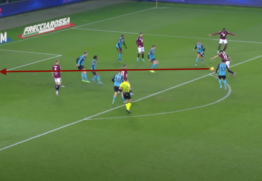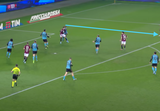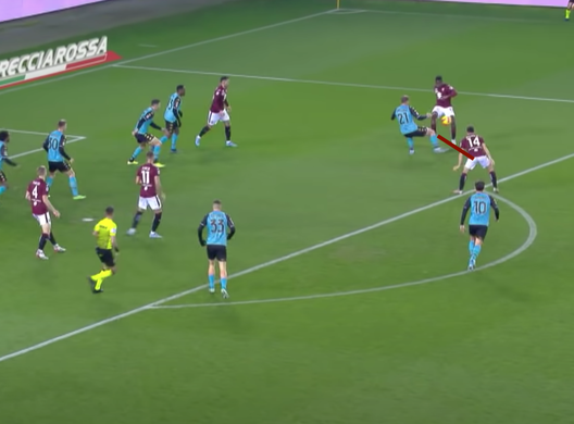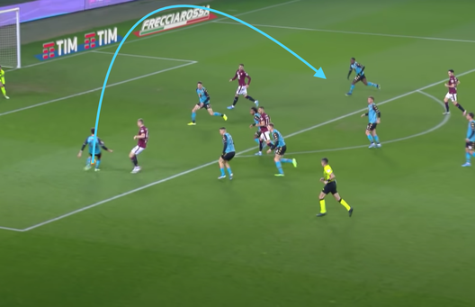 Il croato arrivato al limite dell'area viene contrastato da Busio, sulla seconda palla si inserisce Pobega che si allunga la palla e Ampadu rinvia come può alzando un campanile.