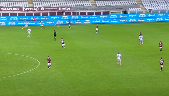 Qua c'è l'unico errore dei granata. Lukic tiene con troppa leggerezza Zaccagni che quindi può girarsi e guardare la porta granata. Così il fantasista di Juric vede lo scatto di Dimarco (Singo in leggero ritardo) e lancia per il compagno di squadra.