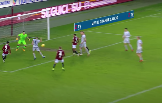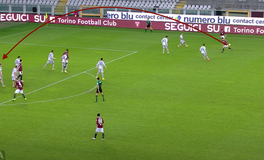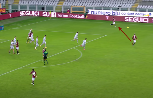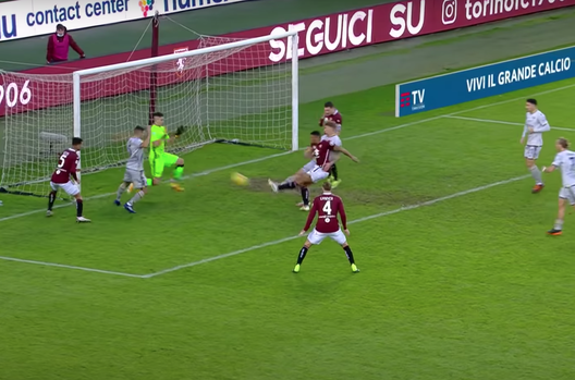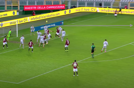 Nel finale il Torino pareggia. Angolo dalla destra per i granata. Verdi sceglie di battere con il destro a uscire e non con il mancino a rientrare.