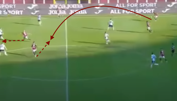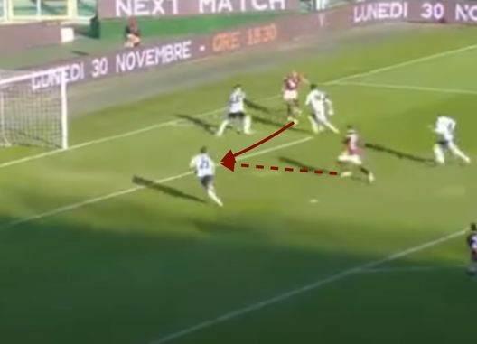 Il gol del 2-0 è figlio di un buon dialogo tra Bonazzoli e Zaza. Tutto ha inizio da un lancio di Izzo, Zaza attacca la profondità e Bonazzoli viene incontro per ricevere.
