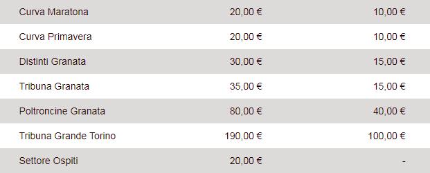 ACQUISTO - Per acquistare i biglietti i canali sono i soliti, ovvero tutti i punti Vivaticket o sul sito della stessa rivenditoria. I prezzi, poi, sono i consueti per le partite di campionato, con riduzioni per gli Under 16 in ogni settore: Maratona e Primavera 20€ intero e 10€ ridotto, Distinti 30€ intero e 15€ ridotto, mentre la Tribuna granata 35€ intero e 15€ ridotto.