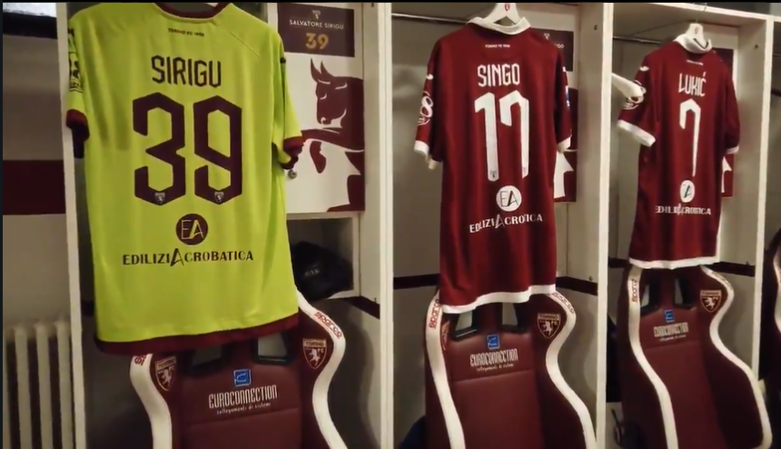19.13 Intanto lo spogliatoio granata è allestito: tutte le maglie sono appese e attendono di essere indossate dai ragazzi.
