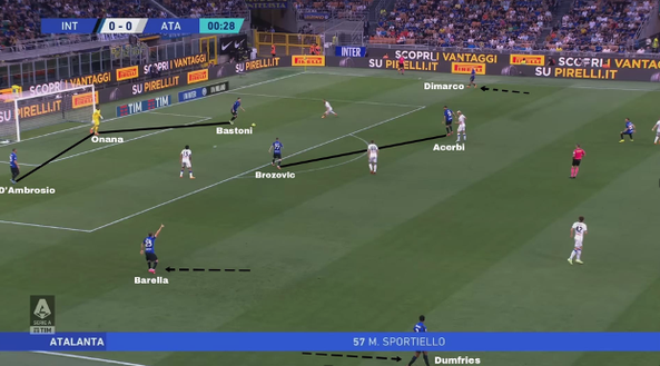 La seconda opzione prevede un quattro più uno con una grande varietà nell’occupazione della linea: possono essere i tre difensori e un centrocampista (permettendo così a entrambi gli esterni di salire), tre difensori e un esterno o in alcuni casi anche Onana può inserirsi in questa linea insieme ai tre difensori. Davanti alla linea, invece, ci sono spesso Brozovic o Calhanoglu.