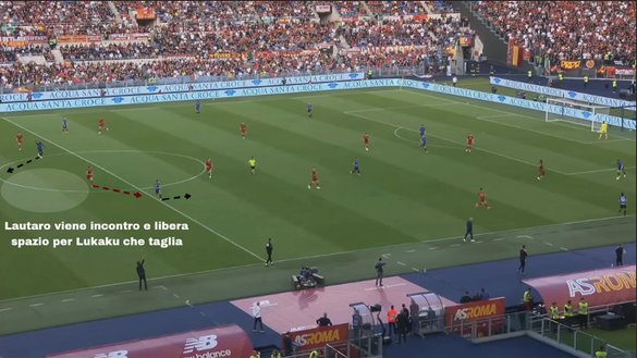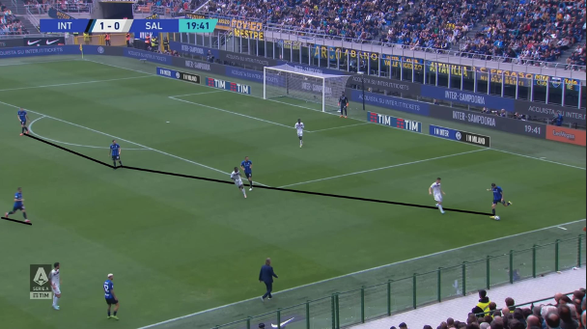 L’Inter può anche decidere di andare direttamente alla ricerca delle due punte (anche se lo fa molto più spesso dopo aver palleggiato nella propria metà campo), che effettuano movimenti alternati per andare a ricevere sul corto o sul lungo.