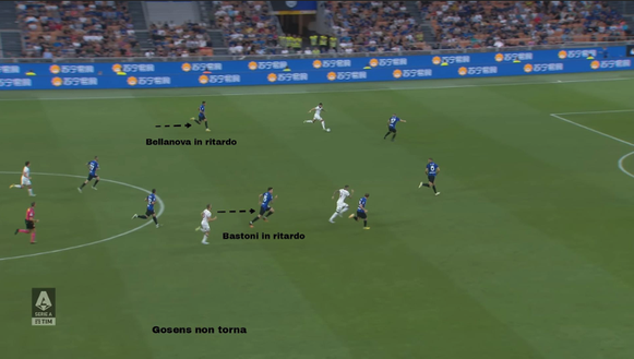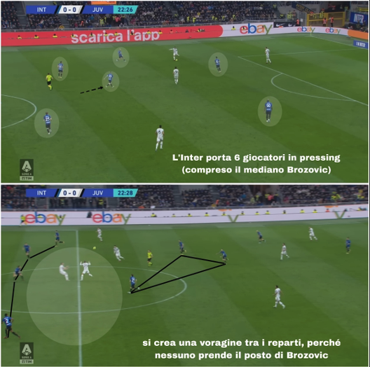 Come detto in precedenza, generalmente il pressing nerazzurro è organizzato ed efficace, ma non è sempre stato così nel corso della stagione: in diverse situazioni i reparti si sono trovati a grande distanza tra di loro, concedendo agli avversari di ricevere negli spazi. Questo perché quando il mediano si alza in pressione, spesso nessuna mezzala va a coprire il buco lasciato libero, liberando un grande spazio tra le linee.