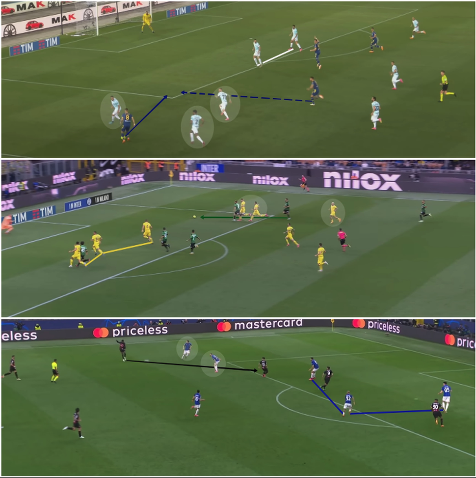 Quando adotta un baricentro basso, l'Inter soffre molto i filtranti nei mezzi spazi: ciò accade perché portando un raddoppio di uomini sulle catene laterali e stringendo i tre difensori in area di rigore per difendere i cross avversari, lasciano spesso troppo spazio tra l’esterno e il difensore laterale, che può essere colmato dall'inserimento di un giocatore avversario.