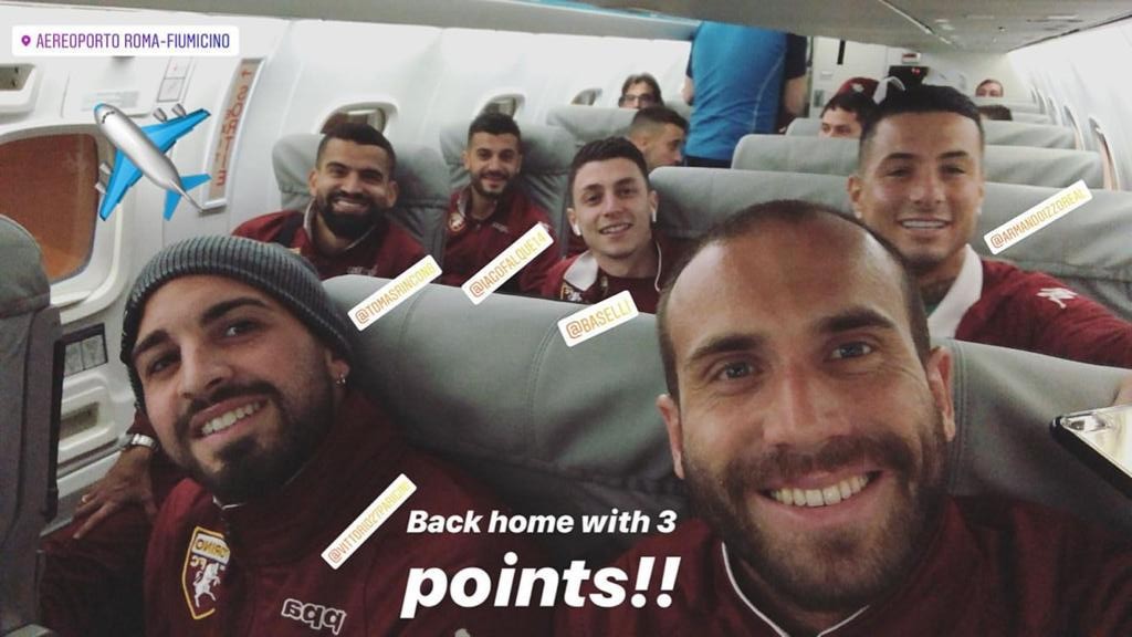 De Silvestri, invece, posta una foto scattata sull'aereo che da Fiumicino ha riportato a Torino la squadra. "Si torna a casa con tre punti" il messaggio del terzino, nella foto insieme a Parigini, Izzo, Baselli, Iago Falque e Rincon.