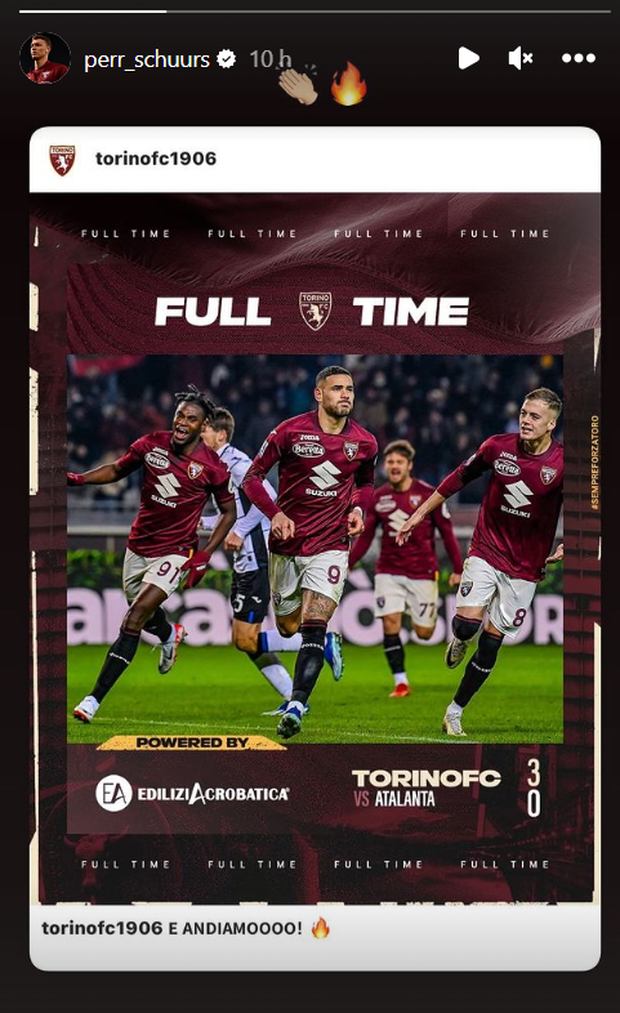 Da lontano gioisce anche Perr Schuurs. Il difensore granata è a riposo dopo l'infortunio al crociato in un percorso di recupero che sarà lungo. Nonostante l'assenza dal campo, Schuurs resta vicino ai compagni e sui social ha repostato le immagini più significative dell'esultanza granata. Emoji degli applausi e del fuoco per un Toro che ha meritato gli applausi dopo i novanti minuti disputati con la Dea e che si è dimostrato on fire.