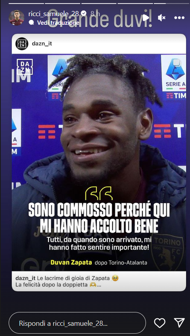 Tra le note liete per il Torino c'è anche il ritorno di campo di Samuele Ricci, subentrato a Linetty per gli ultimi sei minuti più recupero. Ricci, assente per lesione al bicipite femorale della coscia destra da un mese, ha riassaporato il campo ed esultato insieme ai compagni per una vittoria che serviva in termini di punti e morale. "Una notte magica" ha scritto Ricci a corredo dell'esultanza del terzo gol granata. E nelle stories anche il centrocampista granata ha fatto i complimenti a Zapata, postando l'estratto dell'intervista commossa dell'attaccante: "Grande Duvi".