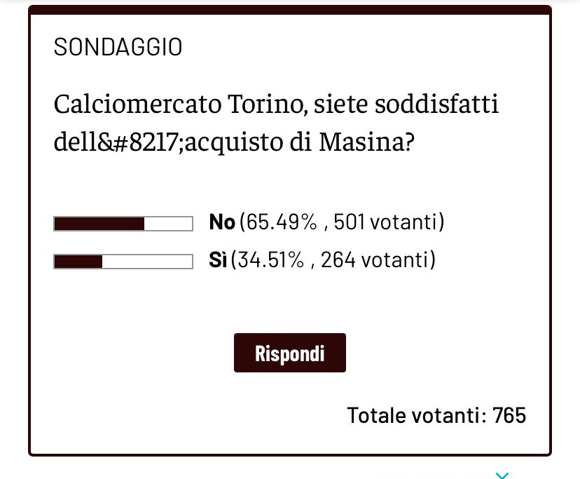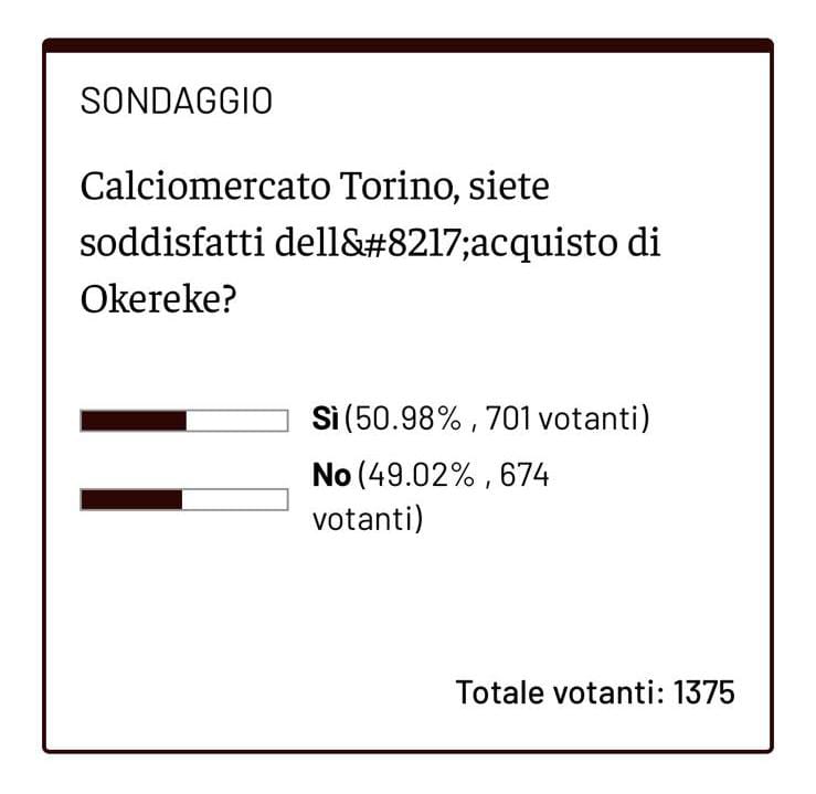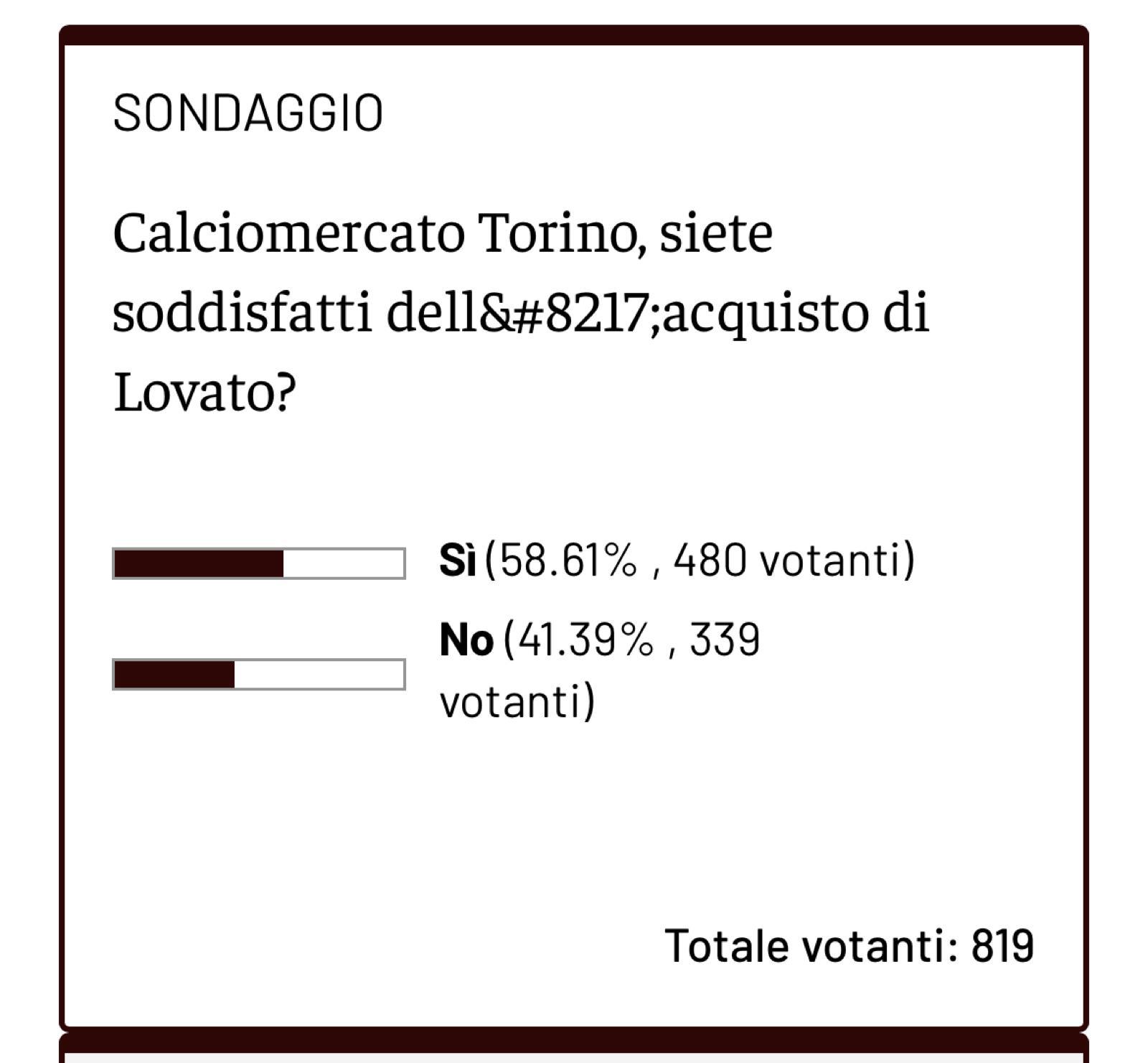 ToroNews ieri ha chiesto ai suoi lettori un parere sui nuovi arrivi: Lovato, Masina e Okereke. I pareri sono divisi: la maggioranza dei lettori si trova d'accordo sul trasferimento di Lovato. Il si vince sul no con il 58,59% (480 votanti). Opposto è il giudizio su Masina: i contrari sono nettamente maggiori dei favorevoli all'arrivo dell'esterno italo-marocchino. Infine, Okereke divide sono 701 i si (50,98%) e 674 i no (49,02%).