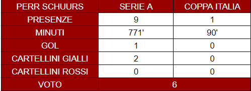 —Il voto non può che essere sufficiente, un 6. Una sufficienza contenuta e non elevata viste le sole 10 presenze stagionali (9 in Serie A e 1 in Coppa Italia) prima dell'infortunio che ha costretto il giocatore a interrompere l'ottimo inizio di stagione con 861' disputati senza mai essere stato sostituito. Schuurs sicuramente uno dei pochi positivi a inizio campionato e la sua assenza, soprattutto all'inizio, è pesata molto sia nel reparto difensivo che per tutta la squadra: ha dimostrato di essere un difensore di sicura affidabilità e abile in tutte le fasi di gioco.