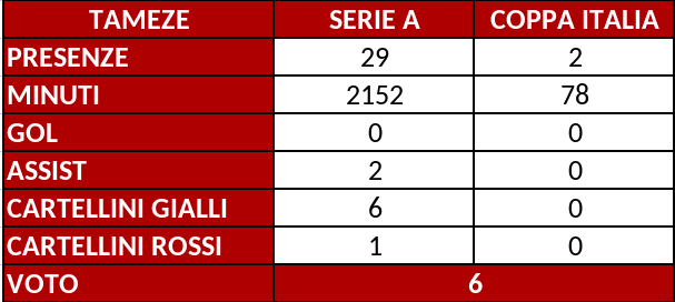 Una stagione discreta per il centrocampista granata. Un soldato di Ivan Juric che ha risposto presente alla chiamata soprattutto nei momenti di difficoltà. Il lavoro ricoperto in difesa è stato dettato dall'emergenza difensiva che ha attanagliato il Torino per buona parte della prima stagione e anche dopo. Impiego ricoperto con senso di sacrificio, che ha permesso a Tameze di riscoprirsi ancora una volta duttile.© RIPRODUZIONE RISERVATA
