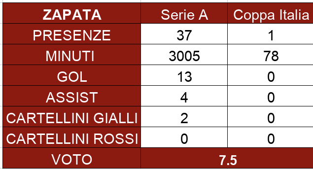 La stagione del giocatore non si può che reputare positiva. Molti sono stati i gol segnati da Zapata, 12 in totale in campionato. La punta che serviva forse è arrivata troppo tardi nella gestione Juric. Non ci sono stati solo i gol, ma anche un importante lavoro col fisico e tanto movimento senza palla per aprire gli spazi. Il tutto con una fase offensiva sterile come quella del Torino di questa stagione, dato che conferma le grandi doti del giocatore. A prescindere dal prossimo tecnico, Zapata è già una certezza.© RIPRODUZIONE RISERVATA