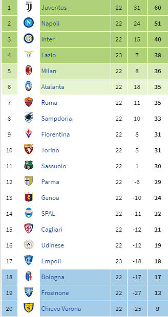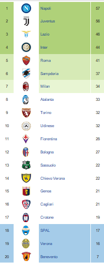 La classifica 2018/2019