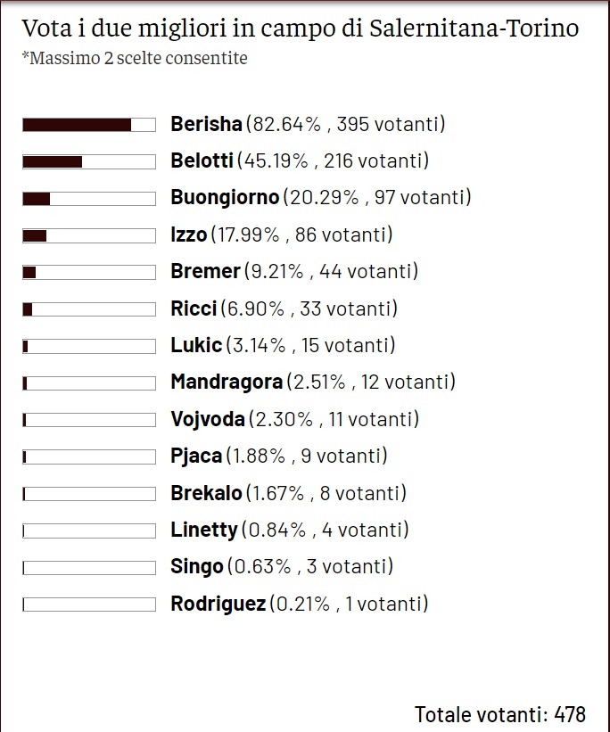 Come di consueto, dopo ogni partita di campionato del Torino, chiediamo ai lettori di Toro News, attraverso il Toro News Award - premio che a fine stagione decreterà chi ha avuto il miglior rendimento stagionale - di votare i due migliori granata in campo dell'ultimo turno di Serie A. Questa volta, la partita in questione è quella di sabato 2 aprile contro la Salernitana, terminata con la vittoria di misura degli uomini di Juric per 0-1. Ad aggiudicarsi il titolo di migliore in campo è Etrit Berisha, scelto da 395 votanti su 478 totali. Secondo posto invece per Andrea Belotti, scelto da 216 lettori. Terzo gradino del podio infine per Alessandro Buongiorno con 97 voti.