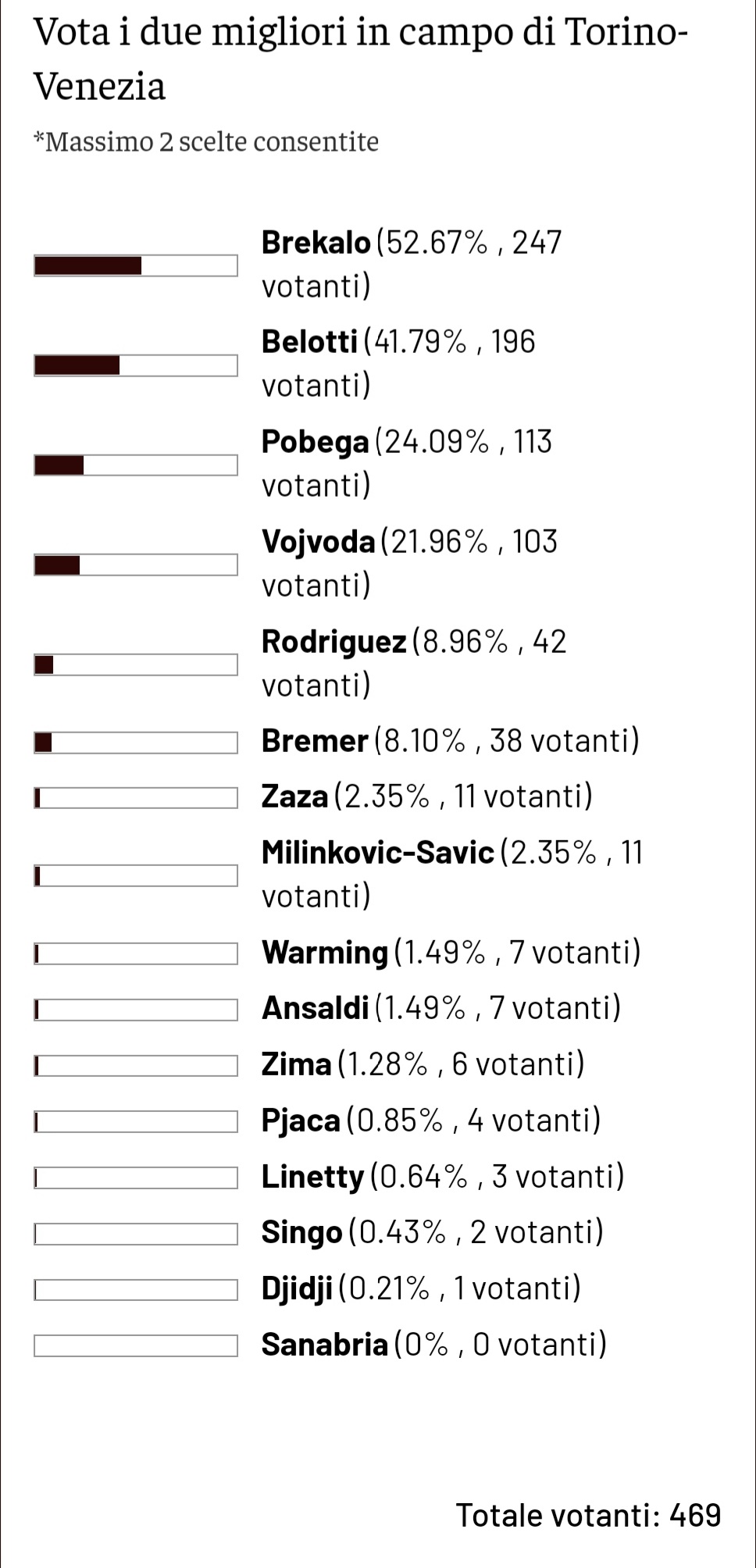 Come di consueto, dopo ogni partita di campionato del Torino, chiediamo ai lettori di Toro News, con il Toro News Award - premio che a fine stagione decreterà chi ha avuto il miglior rendimento stagionale - di votare i due migliori granata in campo dell'ultimo turno di Serie A. Questa volta, la partita in questione è quella di sabato 12 febbraio contro il Venezia, terminata con la vittoria dei lagunari di Zanetti in rimonta. Ad aggiudicarsi il titolo di migliore in campo tra i granata è Josip Brekalo, scelto da 247 votanti su 469 totali. Secondo posto invece per Andrea Belotti, scelto da 196 lettori, che ritorna a muovere la sua classifica nel TN Award nel suo primo match dopo l'infortunio. Terzo gradino del podio per Tommaso Pobega con 113 voti.