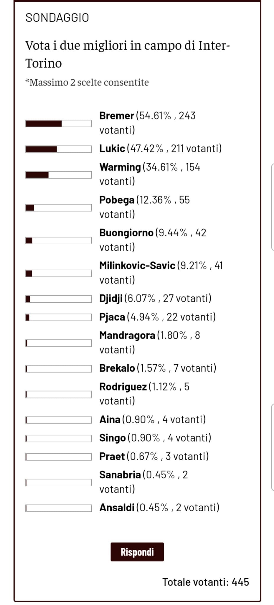 Come di consueto, dopo ogni partita di campionato del Torino, chiediamo ai lettori di Toro News, con il Toro News Award - premio che a fine stagione decreterà chi ha avuto il miglior rendimento stagionale - di votare i due migliori granata in campo dell'ultimo turno di Serie A. Questa volta, la partita in questione è quella di mercoledì 22 a San Siro contro l'Inter, l'ultima del girone di andata. Ad aggiudicarsi il titolo di migliore in campo è Bremer, scelto da 243 votanti su 445 totali: il centrale brasiliano riaggancia quindi Pobega in seconda posizione a quota 27 punti (sempre primo con 3 lunghezze di vantaggio il croato Josip Brekalo). A seguire, il secondo giocatore che più è piaciuto ai lettori di Toro News è Lukic, con 211 voti totali a suo favore che portano il centrocampista serbo a 16 punti. All'ultimo gradino del podio, invece, troviamo Warming con 154 voti: il giovane attaccante danese fa così il suo ingresso in graduatoria.
