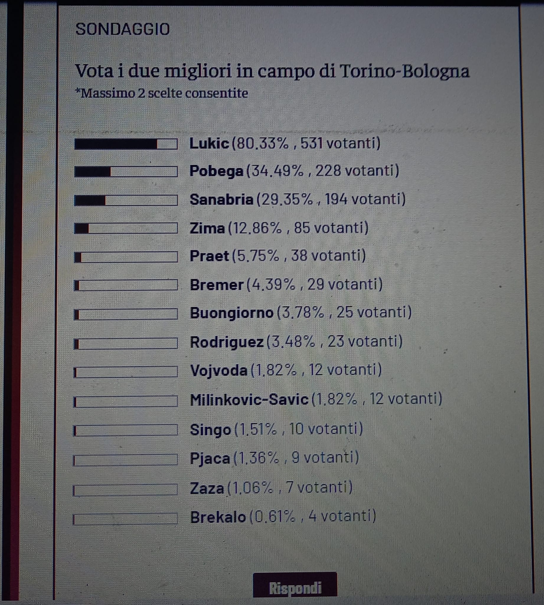 Come di consueto, dopo ogni partita di campionato del Torino, chiediamo ai lettori di Toro News, con il Toro News Award - premio che a fine stagione decreterà chi ha avuto il miglior rendimento stagionale - di votare i due migliori granata in campo dell'ultimo turno di Serie A. Questa volta, la partita in questione è quella di domenica all'Olimpico Grande Torino contro il Bologna. Ad aggiudicarsi il titolo di migliore in campo è Lukic, scelto da 531 votanti su 661 totali, il serbo con 5 punti sale al quarto posto nella classifica generale. A seguire, il secondo giocatore che più è piaciuto ai lettori di Toro News è Pobega, con 228 voti totali a suo favore: il centrocampista triestino raggiunge così Bremer in seconda posizione. All'ultimo gradino del podio, invece, troviamo Sanabria con 194 voti: il paraguaiano stacca Praet e va a quota 10 punti in classifica.