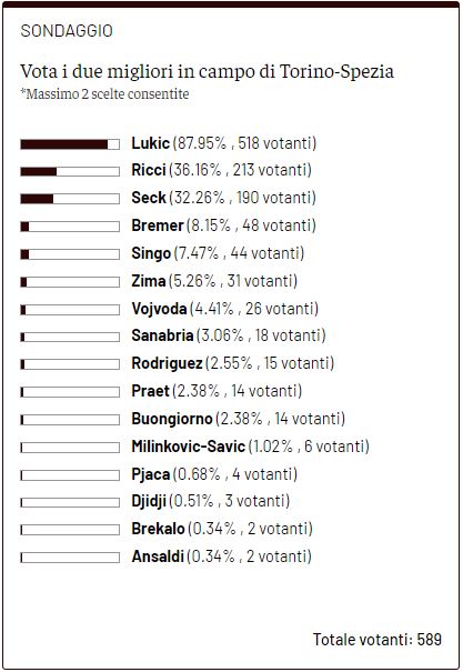 Come di consueto, dopo ogni partita di campionato del Torino, chiediamo ai lettori di Toro News, attraverso il Toro News Award - premio che a fine stagione decreterà chi ha avuto il miglior rendimento stagionale - di votare i due migliori granata in campo dell'ultimo turno di Serie A. Nel match di sabato contro lo Spezia è risultata decisiva la doppietta di Sasa Lukic per il 2-1 finale in favore dei granata. Ed è proprio il centrocampista serbo ad essere stato votato come il migliore in campo da parte dei nostri lettori con ben 518 preferenze che equivalgono all'87,95% del totale dei votanti. Al secondo posto troviamo Samuele Ricci che ha raccolto 213 voti. Sul gradino più basso del podio c'è spazio invece per Demba Seck, scelto per 190 volte dai lettori di Toro News. Un piazzamento che consente all'ex Spal di guadagnare il suo primo punto in questa speciale classifica.
