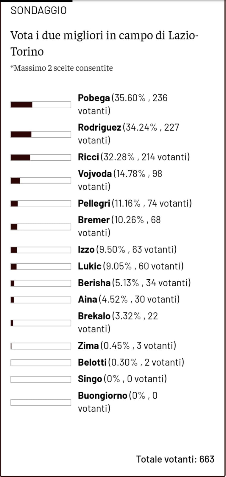 Come di consueto, dopo ogni partita di campionato del Torino, chiediamo ai lettori di Toro News, attraverso il Toro News Award - premio che a fine stagione decreterà chi ha avuto il miglior rendimento stagionale - di votare i due migliori granata in campo dell'ultimo turno di Serie A. Questa volta, la partita in questione è quella di sabato 16 aprile contro la Lazio, terminata con un pareggio per 1-1. Ad aggiudicarsi il titolo di migliore in campo è Tommaso Pobega, scelto da 236 votanti su 663 totali. Secondo posto invece per Ricardo Rodriguez, scelto da 227 lettori. Terzo gradino del podio infine per Samuele Ricci con 214 voti.