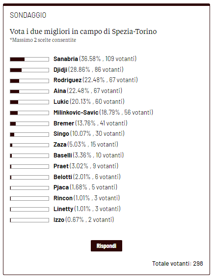 LE REGOLE - Come si svolge questa competizione? Dopo ogni partita di campionato verrà pubblicato sul nostro sito un sondaggio, in cui chiederemo a ogni utente di indicare due voti per scegliere i due giocatori del Torino che più si sono distinti in quel singolo match. Ai calciatori, in base al numero di voti, verranno attribuiti dei punteggi: 5 punti al più votato, 3 punti al secondo più votato, 1 punto al terzo. Al termine della stagione, il calciatore del Torino che risulterà avere conquistato più punti si aggiudicherà il Toro News Award 2021/2022 succedendo nell’albo d’oro ad Andrea Belotti, campione dell'edizione 2020/2021. I sondaggi avranno la durata di 24 ore. (NOTA BENE: Nella visualizzazione dei risultati, poiché ogni lettore ha due preferenze, le percentuali si riferiscono al numero totale dei votanti: ad esempio, se un giocatore coglie il 50% dei voti, significa che è ricaduto in una delle due preferenze della metà dei votanti totali).