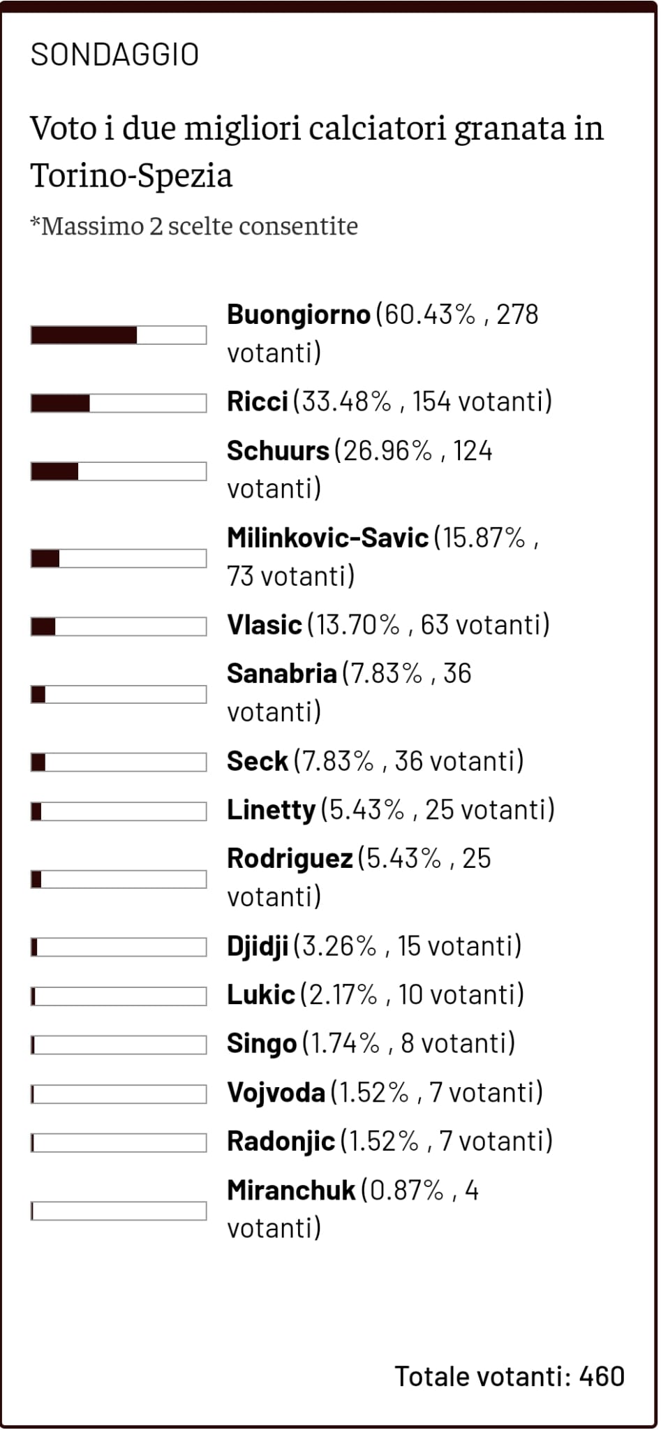 —Come si svolge questa competizione? Dopo ogni partita di campionato verrà pubblicato sul nostro sito un sondaggio, in cui chiederemo a ogni utente di indicare due voti per scegliere i due giocatori del Torino che più si sono distinti in quel singolo match. Ai calciatori, in base al numero di voti, verranno attribuiti dei punteggi: 5 punti al più votato, 3 punti al secondo più votato, 1 punto al terzo. Al termine della stagione, il calciatore del Torino che risulterà avere conquistato più punti si aggiudicherà il Toro News Award 2022/2023 succedendo nell’albo d’oro a Gleison Bremer, campione dell'edizione 2021/2022. I sondaggi avranno la durata di 24 ore. (NOTA BENE: Nella visualizzazione dei risultati, poiché ogni lettore ha due preferenze, le percentuali si riferiscono al numero totale dei votanti: ad esempio, se un giocatore coglie il 50% dei voti, significa che è ricaduto in una delle due preferenze della metà dei votanti totali). Nella visualizzazione dei risultati, poiché ogni lettore ha due preferenze, le percentuali si riferiscono al numero totale dei votanti: ad esempio, se un giocatore coglie il 50% dei voti, significa che è ricaduto in una delle due preferenze della metà dei votanti totali).