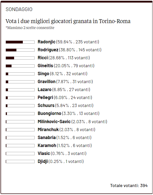 Come di consueto, dopo ogni partita di campionato del Torino, chiediamo ai lettori di Toro News, con il Toro News Award - premio che a fine stagione decreterà chi ha avuto il miglior rendimento stagionale - di votare i due migliori granata in campo dell'ultimo turno di Serie A. A raccogliere più voti di tutti è stato Nemanja Radonjic che con 235 preferenze risulta essere il migliore sceso in campo contro la Roma. Alle sue spalle si piazza Ricardo Rodriguez con 145 voti raccolti dai tifosi granata. Infine, sul gradino più basso del podio, si trova Samuele Ricci che è stato votato 113 volte.