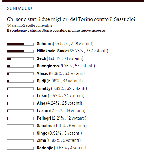 Come di consueto, dopo ogni partita di campionato del Torino, chiediamo ai lettori di Toro News, con il Toro News Award - premio che a fine stagione decreterà chi ha avuto il miglior rendimento stagionale - di votare i due migliori granata in campo dell'ultimo turno di Serie A. In seguito alla partita persa per 0-1 in casa contro il Sassuolo, il giocatore del Torino che ha raccolto più voti è stato Perr Schuurs con 358 preferenze, mentre alle sue spalle si è piazzato Vanja Milinkovic-Savic, che si è fermato a 357, un solo voto in meno all'olandese. Sul gradino più basso del podio, infine, troviamo Demba Seck, scelto da 71 votanti su 1.031.
